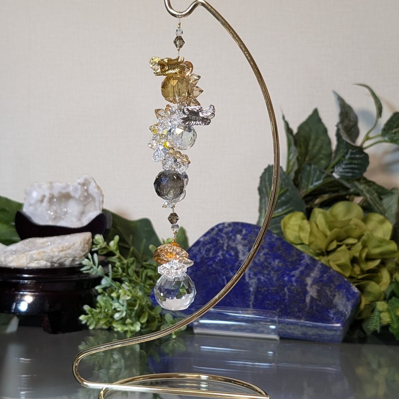 サンキャッチャー 双龍は、美しい陽の光をキャッチしてキラキラと輝くアイテムです。お部屋に飾って、自然光を色とりどりに反射させることができます。スタンドが付いているので、簡単に設置できる点も魅力的です。