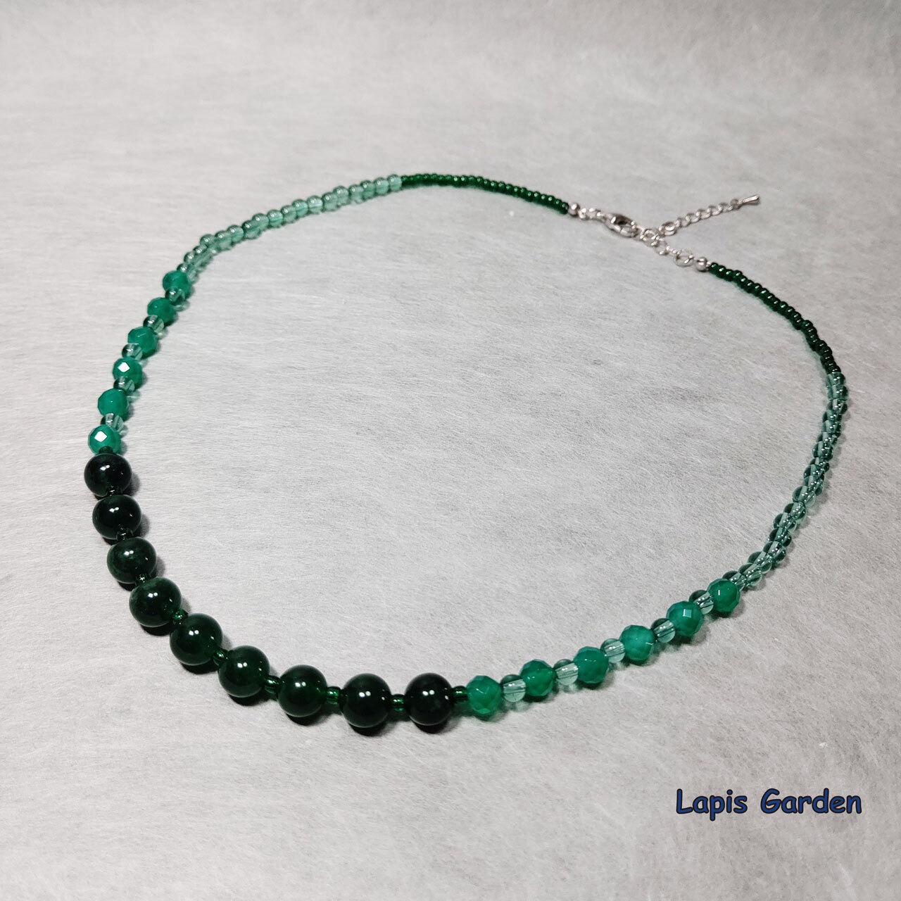 天然のグリーンクォーツァイト、グリーンアゲート、グリーン水晶の3種類の天然石を使用しています。それぞれの石が繊細な色合いを持ち、光によってさまざまな表情を見せます。このネックレスは、日常使いからパーティーシーンまで幅広く対応しており、おしゃれなアクセントになります。長さは調節可能なため、様々なスタイルに合わせることができます。